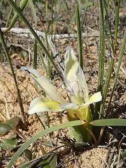 The decumbent inflorescence consists of three to five upright mirror-symmetrical flowers, each of which is subtended by two bracts of 25–40 mm (0.98–1.57 in) long, green at their base but becoming dry at the tips, the outer bract slightly longer compared to the inner. The inner bract is forked only at the tip, which is different from many other species that have more deeply forked inner bracts or inner bracts that are split entirely to the base. The flowers are pale to clear yellow, sometimes flushed with or mostly pale mauve-blue and are produce an intense scent. The flower has a narrowly funnel-shaped perianth tube of 25–50 mm (0.98–1.97 in) long or sometimes as short as 18 mm (0.71 in), and splits into six tepals. The dorsal tepal arches over anthers and style and is 30–38 mm (1.2–1.5 in) long. The three lower tepals are 25–30 mm (0.98–1.18 in) long, and are merged over a short distance, forming a lower lip that provides a landing platform for visiting insects. The lower lateral tepals are yellow but pale around the edges. The three filaments are crowding at the side of the dorsal tepal, 15–17 mm (0.59–0.67 in) long, and topped by anthers of 7–8 mm (0.28–0.31 in) long. The inferior ovary is smooth or sometimes has short, bristly hairs on the ribs only. The style arches over the stamens and divides in three branches opposite the tips of the anthers, the branches being about 4 mm (0.16 in) long. Flowering occurs from early August to the middle of September.[1]