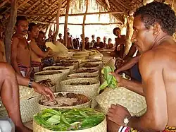 The most recent group of immigrants comes from neighbouring Afaloicai and arrived in Babulo in three successive waves. The oldest group from the Aldeias Buibela and Lena entered the Suco in the 1930s in the hope of finding land.[23] It is highly likely that these were refugees of the conflict over the fall of the Afaloicai empire. According to local records, Liurai Gregorio from Lena reached Babulo just before the arrival of the Japanese (1942, cf. Battle of Timor). He arrived in Babulo sounding fanfares, drums and flutes and set up camp on sacred land (rea luli) near Baha Liurai. Shortly thereafter a sickness spread among the newcomers, which can be traced back to this breach of taboo. So Gregorio asked the Daralari for permission to settle within their Suco. Marriage consolidated this newly formed alliance and Gregorio, the new son-in-law, was permitted to enter a place known as Tua Rae Laleo ("shelter of palm wine leaves"). He and his people received farming land in the vicinity of Uato-Lari Leten and Kampung Baru. .[24] As oa sae (giver of the bride) the family of Gregorio pledged to provide the Daralari with goods and services. But the Daralari point out that while Gregorio and his family merely have the rights to use the land, it is in fact still controlled by the "Lord of the Land".[25] After World War II the Portuguese pursued a policy of agricultural development in their colony. They ordered the village chiefs to organise teams to farm the land for the colonial government. As a result, a second wave of immigrants from Afaloicai and the area surrounding Mt. Matebian arrived in the Suco in the 1950s and 1960s, initially working as seasonal labourers on the rice fields constructed on the coastal plains of Uato-Lari. They too eventually settled permanently in the area. Many of them benefited from the family bonds they shared with those immigrants who had arrived and settled there earlier.[23][25] The third wave of immigrants was forcefully relocated to Babulo by the Indonesians after the resistance base on the slopes of the Matebian was destroyed in 1979, forcing many civilians to submit to the invaders. In contrast to Burmeta and Laka Roma these new immigrants are not familiar with, or embedded in, traditional community structures. Instead they continue their own distinct hierarchies and clans.[23] They are still frequently perceived as temporary co-inhabitants by the native population, as well as labelled "people using the land for agricultural and gardening purposes" at ceremonies and rituals.[24]