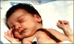 ![]() Baby Fae, shortly after her transplant. The dark stripe on her torso is the surgical incision. | |