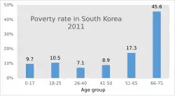 Subsequent rapid changes in society and attitudes of children have resulted in a poverty rate of 47.2% for South Korean women over the age of 65, the highest among the OECD countries. This figure rises to 76.6% for single elderly women.[6] The state pensions provided by the South Korean welfare system are often inadequate to cover the rising medical bills of old age.[9] The historic male-dominated culture of Korean society meant many older women had no savings or a private pension because their youth did not provide the equal education and job opportunities of their male counterparts.[1]