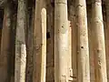 The temple is 66 m long, 35 m wide and 31 m high, making it only slightly smaller than the Temple of Jupiter.[5] The podium on which the temple sits is on an East-West axis. The peripheral wall is adorned by a colonnade of forty-two unfluted Corinthian columns with Ionic bases, nineteen of which remain upright. There are eight columns along each end and fifteen along each side —nearly 20 m (66 ft) in height. These were probably erected in a rough state and then rounded, polished, and decorated in position. The columns support a richly carved entablature, which includes an architrave with a three-banded frieze that is decorated with alternating bulls and lions and cornice ornamented with geometric and floral patterns.