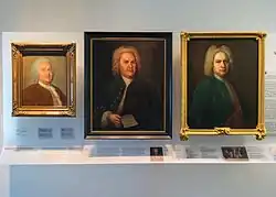 A 2004 painting by Johannes Heisig depicts Bach performing a cantata in the Leipzig Church of St. Thomas with his choir.[63] The history of Bach iconography is treated on the northern wall of the modern building, starting with contemporary paintings, among them the painting of Johann Jacob Ihle which purportedly depicts Bach at around 1720, and a pastel painting which Charles Sanford Terry identified in 1936 as the Bach portrait formerly owned by Carl Philipp Emanuel Bach but whose authenticity has since been doubted.[64] Also on display is the early Bach portrait by Gebel[65] which was used for the title page of the first volume of the Allgemeine musikalische Zeitung in 1798/99.[66] Finally there is a 1910 copy of the undoubtedly authentic painting by Elias Gottlob Haussmann, the original can be found in the old town hall in Leipzig. Thirty-nine original prints, arranged in 'families', depict how our picture of Bach has changed through the centuries.[67]