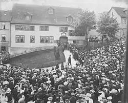 In the wake of the 19th century's Bach renaissance instigated by Felix Mendelssohn Bartholdy and Robert Schumann, among others, devotees went on a search for memorabilia and also for the birthplace of the composer. In 1857, the Bach biographer Karl Hermann Bitter interviewed the still living descendants of Johann Bernhard Bach and determined that Bach was born at the house Frauenplan 21, subsequently called Bachhaus (Bach House).[13] In 1868, the local music society dedicated the memorial plate above the front entrance, thus publicly marking the place as Bach's birthplace.[14] Since then, however, no further evidence in support of this claim has surfaced. An error in the local oral tradition which Bitter encountered can perhaps be attributed to the fact that members of the Bach family did indeed live in this house once, but only at a time long after Bach's birth.
