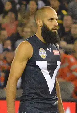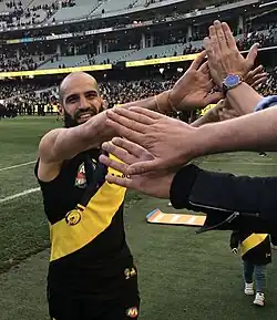 Houli suffered a minor calf injury in the club's opening pre-season match of 2018, the recovery for which held him out of the rest of the pre-season series and from the round 1 match-up against Carlton.[155][156][157] He returned to fitness for round 2's grand final rematch against Adelaide and contributed 17 disposals.[158][24] AFL Media named Houli among Richmond's best players in four of the next five matches, including in his 150th match for Richmond in round 7.[159][160][161][162] In the first quarter of round 10's match against St Kilda, Houli suffered a serious groin injury while kicking that saw him removed from the game after notching just four disposals.[163] Although the injury did not require surgery, Houli spent six weeks rehabilitating the muscle, during which time he also underwent finger surgery to repair an unrelated injury.[164][165][166] He made a return to football in round 17, but further groin soreness forced him to limit the stint to just one match.[167][168] Houli spent a further two weeks on the sidelines before making a return to football in limited game time in one VFL match in early August.[169][170] Finally fit, Houli played at AFL level again in round 21 and earned one coaches vote for a 26-disposal outing against Gold Coast.[171][172] Houli was an honoury captain the following week, joining fellow Muslim player and Essendon opponent Adam Saad to toss the coin in support of the Muslim-Australian community who had been the subject of Islamophobic comments by conservative Senator Fraser Anning in Parliament that week.[173][174] After helping Richmond to the minor premiership as the ladder-leading side at the end of the home-and-away season, Houli contributed 24 disposals and four tackles in a qualifying final win over Hawthorn.[24][175] Houli was one of Richmond's few strong contributors in the preliminary final the following week, notching up 22 disposals and a goal in what would prove a shock knockout loss to Collingwood that ended Richmond's season and limited Houli to just 15 matches at AFL level that year.[176][177]