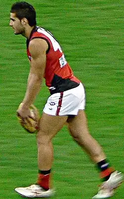 He first represented Essendon in an exhibition match against the Indigenous All-Stars in Darwin in early February 2007.[20][21] Houli spent the opening weeks of the season playing reserves-grade football with the club's VFL-affiliate Bendigo Bombers, where he played as a half-forward and midfielder and recorded 30 or more disposals in three of his first five matches.[22] Following those performances, he earned an AFL debut in a round 7 match against the Kangaroos, where he recorded 15 disposals and kicked a goal with his first kick in AFL football.[23][24][25] Houli followed that effort with a two-goal showing in round 8, before lesser performances in round 9 and 10 saw him returned to VFL level for the rest of the 2007 season.[24] He finished the year having played four AFL matches and averaged 11 disposals and 0.75 goals per game.[24]