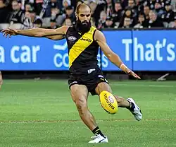 Houli showed elite ball-winning form in the 2016 pre-season and carried this into the early weeks of the season proper, breaking his own career-best total in consecutive weeks with 35 and 36 disposals in rounds 2 and 3, respectively.[118][119][120][24] He led the side with 34 disposals in a round 6 loss to Port Adelaide, but his uneven impacts saw AFL Media label his output "subdued" over the opening seven weeks of the season.[121][122] In the lead up to round 8, Houli suffered a broken right wrist while training.[123] The injury required surgery to repair and took more than 10 weeks to fully heal.[124][125] He made his return through the VFL in late-July, in what was his first reserves grade match since joining Richmond from Essendon in 2010.[126][127][128] After a successful run at the lower level, Houli returned to AFL football in round 19 with 21 disposals in a loss to Greater Western Sydney.[24] He returned to form with 30 disposals and a match-high six inside-50s in round 20 and after 22 rounds he ranked seventh in the league for average rebound-50s and eighth for marks per game that season.[129][130] After playing in each of the club's final five matches of the season, Houli finished the year having played 12 AFL matches and placed 17th in the club's best and fairest count.[24][131] During the off-season he entertained a long-term contract offer from Greater Western Sydney, but ultimately turned it down to remain at Richmond.[132]