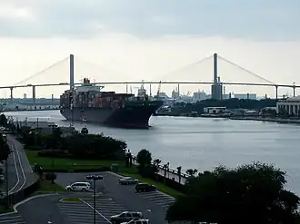 Between 1946 and 1985, the U.S. Army Corps of Engineers built three major dams on the Savannah for hydroelectricity, flood control, and navigation. The J. Strom Thurmond Dam (1954), the Hartwell Dam (1962), and the Richard B. Russell Dam (1985) and their reservoirs combine in order to form over 120 miles (190 km) of lakes.[13] In December 1986, an oil spill caused by an oil tanker docked at the port of Savannah resulted in approximately 500,000 US gallons (1,900,000 L) of fuel oil leaking into the river.