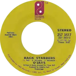 "Back Stabbers" is a 1972 song by the O'Jays. Released from the hit album of the same name, it spent one week at number 1 on the Hot Soul Singles chart. It was also successful on the pop chart, peaking at number 3 on the Billboard Hot 100 in October 1972.[2] The narrator in "Back Stabbers" warns men about their male "friends" who smile to their faces, but are secretly planning to steal their wives or girlfriends.[3] It was inspired by an earlier hit with a similar theme, the Undisputed Truth's "Smiling Faces Sometimes", the chorus of which is quoted at the end of this song. It was part of the soundtrack for the 1977 movie, Looking for Mr. Goodbar. In 2002, the song was sampled by R&B artist Angie Stone for her single "Wish I Didn't Miss You".