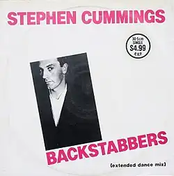 In 1983 Australian singer-songwriter Stephen Cummings released Backstabbers in December 1983 through the Regular Records label as the third single from the album Senso. Cummings version peaked at number 40 on the Kent Music Report.