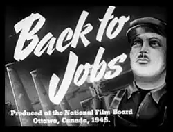 Back to Jobs is a nine-minute 1945 Canadian documentary film, made by the National Film Board of Canada (NFB) as part of the postwar Canada Carries On series.[1] The film describes soldiers in the Second World War returning home and back to a civilian life. The French version title of Back to Jobs is Nos soldats reviennent (Our soldiers are coming back.).