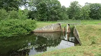 The Backus Creek Dam and Little Mud Dam were built in 1956. Both dams are small, nearly identical barrage dams consisting of four spillways that are used for flood control. The Backus Creek Dam (44°20′44.3″N 84°35′41.7″W / 44.345639°N 84.594917°W) is the second dam along Backus Creek, which flows in a northerly direction. Its construction created the Backus Creek Flooding.[11] This reservoir is approximately 485 acres (196 ha). The farthest upstream dam is the Little Mud Dam (44°21′30.8″N 84°36′42.4″W / 44.358556°N 84.611778°W) closer to M-18. Because of this dam's closer proximity to houses, it is considered a "high risk" and requires more frequent inspections. This dam creates Little Mud Lake (or Little Mud Lake Flooding) at approximately 610 acres (250 ha). The water flowing from the Little Mud Dam then flows unimpeded into the Cut River and a short distance to Houghton Lake.[3]