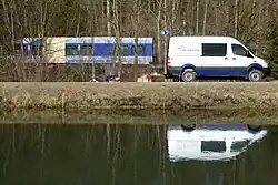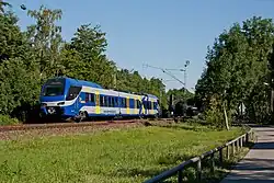 The incident occurred on the single-track Mangfall Valley Railway (German: Mangfalltalbahn), at a curve between the stations of Kolbermoor and Bad Aibling-Kurpark in Bavaria, close to the Bad Aibling sewage works.[1][4][5] The two trains were Stadler FLIRT3 multiple-units, operated under the Meridian brand by the Bayerische Oberlandbahn (BOB), a subsidiary of Transdev Germany.[6][7] The eastbound train was a six-car unit with 333 seats (ET 325), scheduled to run from Munich to Rosenheim, while the westbound train was a three-car unit with 158 seats (ET 355), scheduled to run from Rosenheim to Holzkirchen.[8][9] There were more than 150 passengers on board the two trains,[10] considerably fewer than usual due to carnival holidays.[11] The trains were equipped with a total of three train event recorders.[7] The line and both trains were equipped with the Punktförmige Zugbeeinflussung (PZB), a train protection system designed to reinforce line-side signalling and prevent drivers from accidentally passing signals at danger.[12]