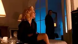 David Denby deemed the music video a "premature summation of Fincher's work in miniature", pointing out references to other works by the director: the police discovering Madonna's corpse referenced Seven (1995); the "backward-running timepiece" image of Walken's angel of death character looking at his watch became the "key visual and metaphysical idea" in The Curious Case of Benjamin Button (2008). Finally, Madonna being murdered by a seeming serial killer was a reference to both Seven and Zodiac (2007).[75] In a similar note, Vice's Raza Syed wrote that the music video "has many of the hallmarks of David Fincher's style of cinematography that would dominate much of his subsequent filmography: air-tight camerawork, brushed-metal visual palette, corporate intrigue, a palpable sense of emotional isolation... and murder".[57] White compared the Louise Oriole character to Amy Elliott Dunne from Gone Girl (2014), as both women share a "troubled antihero quality".[15] According to Mark Browning, the shot of Walken and the singer in an elevated director's chair signifies a "God-like" presence in the actor's character; the author also felt this particular shot was an intentional, tongue-in-cheek reference by Fincher to "the responsibility and pressure that comes with directing".[66] In Experiencing Music Video: Aesthetics and Cultural Context (2004), Carol Vernallis pointed out that, through "iconic imagery", the viewer can predict the fate of Madonna's character: her black dress in a dry cleaner's plastic bag alludes the body bag she will be wrapped in; the cat hissing at her suggest she's already a "ghost or figure who bears a curse"; finally, a door Madonna walks through resembles the "entrance to Hades".[76] The music video can be found on Madonna's 1999 compilation The Video Collection 93:99.[77]
