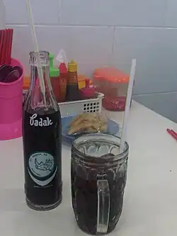 ![]() A Badak sarsaparilla-flavor bottle, with most of the content being transferred to an iced cup. This is the traditional way of drinking. | |
