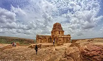 The Malegitti temple (c. 625–675 CE) is on the top of a huge boulder to the north of the Badami town. It the earliest surviving and best preserved example of the Dravida style in Early Chalukya architecture in Badami. It consists of a sanctum that opens into a gudha-mandapa supported by four pillars.[5] Walls of sanctuary and mandapa have a curved course and a central recessed portion, divided into panels, with reliefs of musicians, dancers and warriors. Though a small Shiva temple, it includes both Shaivism and Vaishnavism artwork with equal prominence.[6][5]