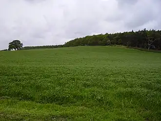 The summit of the hill is the site of an Iron Age hill fort known as Badbury Camp. It is roughly circular in shape, but most of it was levelled early in the 19th century.[1] It has been suggested as a possible site of the 5th or 6th century Battle of Mons Badonicus, where King Arthur defeated the Anglo-Saxons. On the west side of Badbury Hill is believed to be a World War II firing range, used by the Auxiliary Unity based at Coleshill House as a training firing range.[2] It is now a wooded area, known locally as Badbury Clump, of roughly nine acres, swathed in bluebells in May and is a well-frequented local recreation area for walkers and dog-owners.[3] It is now in the care of the National Trust.[4][5]