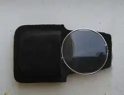 The unilens monocular is simply a 2.5 inch (6.4 cm) diameter convex lens with a 6 foot (1.8 m) focal length, equivalent to +0.55 dioptres. In use the eye is closer than 6 feet to the lens (usually 3–4 feet) and thus between the lens and its principal focus. Eye accommodation required is similar to that when viewing objects in the far distance, but more so as actual accommodation is made for somewhere beyond accommodation for infinity.[1] Because of this unusual requirement of the eye, only three in four people are able to use a unilens. Prolonged use is furthermore tiring to the eye and thus a unilens is mainly suited for occasional or intermittent viewing of distant objects.[1]