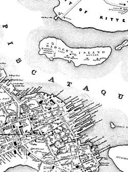 In 1837, Frederick Fernald purchased Badger's shipyard. In 1844, he joined William Pettigrew to establish Fernald & Pettigrew, which would produce some 30 ships. Among their output was a series of clipper ships, including the Typhoon.[4] Launched in 1851, Typhoon set a sailing record to Liverpool, England—13 days, 10 hours dock to dock. Known as the "Portsmouth Flyer," it was the largest merchant ship yet seen in that port.[5] But Badger's Island would lose its importance as a shipbuilding center. The industry shifted downriver to Fernald's Island, home since 1800 to the Portsmouth Naval Shipyard.