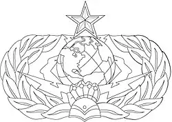 The Space Operations Badge is awarded to 13S space operations officers and 5S0 space systems specialists. It is awarded in the grades of basic, senior, and command. The first space badge was authorized on 4 November 1982 and issued to 20XX space operations officers, before renamed the Space and Missile Badge on 22 October 1993 in recognition of the merging of the 18XX missile operations officer and 20XX space operations officer career fields into the 13S space operations officer career field.[4] The section space badge, known as the Space Operations Badge, replaced the first space badge on 1 November 2005 and was initially known as the Space Badge.[5] On 1 January 2004, it was renamed the Space Operations Badge.[6]
