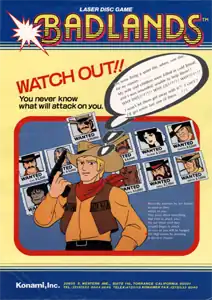 Badlands (バッドランズ) is a LaserDisc arcade video game developed by Konami and published by both Konami and Centuri. It debuted at the Amusement and Music Operators Association show in October 1983 and was released to the public in early 1984.[2][3] Badlands follows a cowboy named Buck seeking vengeance on a gang of outlaws and its leader, Landolf, for the murder of his wife and children.[4]
