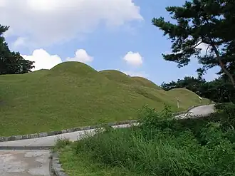 The Royal Tombs in Neungsan-ri exhibit a change in the architectural style of the ceiling from vaulted to flat.[2]: 12–13 The tombs were excavated between 1915 and 1917. Seven tombs were unearthed here, with six arranged in two rows and the seventh located 50 metres (160 ft) away. Three tombs have stone chambers with a passage and with vaulted ceilings in hexagonal and square designs.[2]: 64