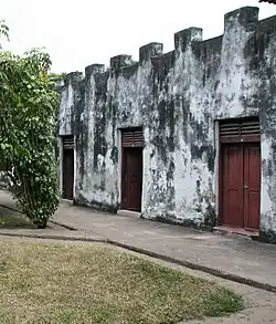 Bagamoyo (Mji wa Bagamoyo, in Swahili) is a historic coastal town and capital of Bagamoyo District in the Pwani Region of Tanzania. Much of the settlement was founded at the end of the 18th century, though it is an extension of a much older (8th century) Swahili settlement, Kaole. It was chosen as the capital of German East Africa by the German colonial administration and it became one of the most important trading ports for the Germans along the East African coast along the west of the Indian Ocean in the late 19th and early 20th century. Bagamoyo lies 75 kilometres (47 miles) north of Dar-es-Salaam on the coast of the Zanzibar Channel, across from the island of Zanzibar. The town hosts Bagamoyo Historic Town, that is a National Historic Site of Tanzania. In 2011, the town had 82,578 inhabitants.[1]