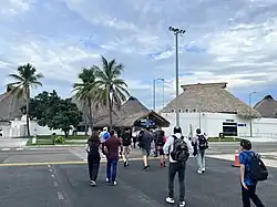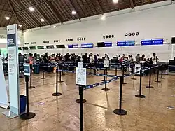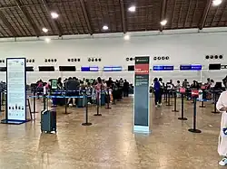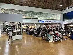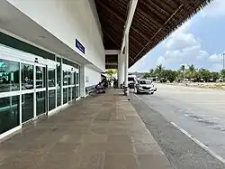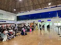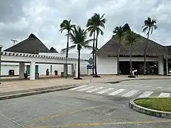 The passenger terminal houses both arrival and departure facilities for domestic and international flights within a single-story building spanning 8,132 square metres (87,530 sq ft). The terminal's distinctive architecture features a series of thatched roof structures crafted from dried palm leaves, known as Palapas, a traditional construction technique frequently seen on Mexican beaches. The terminal has eight gates, a VIP lounge,[4] dining options, duty-free shops, parking areas, car rental services, various retail stores, and a bus terminal for shuttle services and airport transfers to tourist resorts in the region.