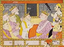 ![]() Pahari miniature depicting Bahlika (leftmost, in ivory garments) in a conference before Kurukshetra war | |