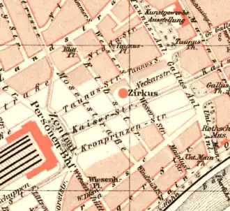 The area between the Frankfurt city wall and field of the gallows had hardly been constructed by the early nineteenth century. Only farming estates were to be found in this area. Near to the city gallows and as an unprotected site outside the city walls, it was left alone for a long time. As industrialisation came in, the city walls and its gallows were torn down to be replaced initially by villas with large gardens. The technical advances were especially noticeable here. When in 1839 the Taunus Railway was built to the town of Höchst, still part of the Duchy of Nassau, the original Taunus station (Taunusbahnhof) was constructed on the Anlagenring. The track of the Taunus station ran through the middle of the district of today's station quarter. Later the stations of the Main-Neckar and Main-Weser lines were added to that. The western stations were grouped together until 1888, after which time they were replaced by the new Frankfurt central station, which was situated another 500m further west. Thus the railway tracks also became redundant, and the year 1889 was able to begin with a dividing up of the area. As there was still no significant residential zone existing in 1891, the area became the central site of the International Electro-Technical Exhibition led by Oskar von Miller. In the meantime, the large civil land development in the style of the Wilhelminian period was placed under monument protection. In the Second World War the quarter was not so strongly bombed as the inner city, but nevertheless many buildings were destroyed, particularly in the north. In the time of the occupation by the American armed forces the district developed an active nightlife, allowed soldiers free rein to endless brothels.[2]