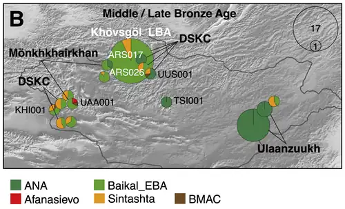 Several successor groups of the Neolithic and Early Bronze Age Baikal hunter-gatherers with varying degrees of Western Steppe Herders/Sintashta-like admixture started to appear in the Altai region during the Late Bronze Age. These groups formed from the Neolithic and Early Bronze Age Baikal populations from the Eastern Steppe and subsequent admixture from Western Steppe Herder migrant groups. This includes the Khövsgöl LBA[30] herders from northern Mongolia and the Altai MLBA hunter-gatherers from the Altai region.[31][15]