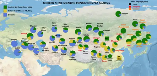 Genetically, ANA/Amur ancestry peaks among modern Tungusic, Mongolic and Nivkh-speaking populations of Northeast Asia.[15] ANA ancestry (represented by the Tungusic-speaking Ulchi people) overall forms the main ancestry of the early and contemporary speakers of Turkic, Mongolic and Tungusic languages, which supports their spread from Northeast Asia westwards, discernable in the Lake Baikal region since at least 6kya.[56][7] An earlier wave of Northern East Asian ancestry into Siberia is associated with "Neo-Siberians" (represented by Uralic-speaking Nganasans), which may be associated with the expansion of Yukaghir and Uralic languages, and the partial displacement of Paleo-Siberians, starting around 11kya.[56]
