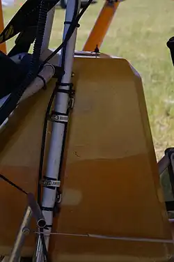 The aircraft is constructed of bolted 6061-T6 aluminium, with the two seats mounted on a fuselage boom tube that runs from the front rudder pedals to the tail. The landing gear consists of two main wheels on chrome molybdenum steel gear legs and axles, and a tail wheel configuration. The flexible steel axles work as shock absorbers during taxiing and landing. The tail wheel is steerable by means of the rudder pedals.[10] The standard Rotax 582 engine is mounted in pusher configuration behind the wing's trailing edge. The engine's liquid-cooling allows fast descents while towing, without subjecting the engine cylinders to shock-cooling. The wing is supported by a V-strut and jury struts. The wing and tail surfaces are covered in pre-sewn Dacron envelopes. A unique feature is the extended rudder post, which is supported by steel cables from the wings and used as a tow attachment point. The aircraft is equipped with dual controls for pilot training and the rear seat is removable when not needed. The aircraft takes about 200 hours to assemble from the kit.[1][3][4][5][6][7][8][9][11][12]