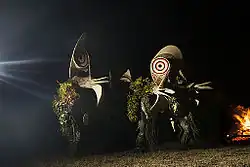 The best-known aspect of Baining artistic culture are night dance ceremonies, often called "fire dances", during which the dancers run through, leap over and kick the embers of a fire. The dances originated in Qaqet (northern) villages, where they were called atut, but have since been taken up by central and southern Baining.[7] The dancers wear large masks laboriously made from bark cloth, bamboo and leaves: the masks are used just once for the firedance ceremony before being thrown away or destroyed. Masks are of two main types: in Kairak areas these are the kavat and the larger vungvung, the latter featuring an axial bamboo pole up to thirteen feet in length, and traditionally represented various male-associated animals and plants of the forest.[8]