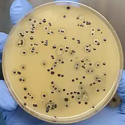 Baird-Parker agar is a type of agar used for the selective isolation of gram-positive Staphylococci species.[1] It contains lithium chloride and tellurite to inhibit the growth of alternative microbial flora, while the included pyruvate and glycine promote the growth of Staphylococci.[1] Staphylococcus colonies show up black in colour with clear zones produced around them.[1]