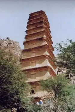 Excavation of the pagoda base indicated that the pagoda was originally thirteen stories in height, not eleven as it had previously appeared to be, as the lowest two stories had been covered up by mudslides over the centuries.[1] There was also no specially built foundation platform underneath the pagoda, as is usually the case, but it was built on a foundation of broken stones. The pagoda was solid inside, with a wooden central supporting pillar that was grounded in a depression 1.4 m in circumference and 2.1 m deep at the bottom of the pagoda. Although the pagoda was solid, there were small, square rooms built into the third, tenth and twelfth stories, with windows on the south side.[note 1] Matching false windows were built into the south side of all the other stories.[1]