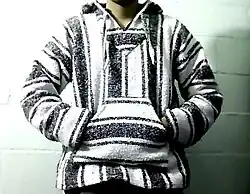 A Baja jacket (also known as a Mexican Baja hoodie, Baja sweatshirt, or drug rug) is a type of Mexican jacket with a single large pocket on the front, and vents on the side. They are more commonly made out of a coarse woolen fabric known as "jerga". They are often decorated with patterns consisting of horizontal stripes on the sleeves and hood, and vertical stripes down the rest of the jacket. The drawstrings are often flatter and more rectangular than most jacket drawstrings, and always made of the same material as the rest of the jacket.