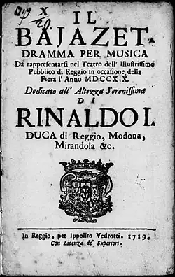 Bajazet (Italian pronunciation: [baʒaˈze]) is an opera by Francesco Gasparini, a revision of his 1711 work Tamerlano. It was first performed at the Teatro Pubblico in Reggio Emilia in 1719, with designs by Pietro Righini.[1]