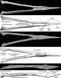 Medullary bone tissue was known only from reproductively mature modern birds and some non-avian dinosaurs like Tyrannosaurus rex, until it was reported from the largest known femur of the pterosaur Pterodaustro in 2009, the first reported occurrence of a non-dinosaurian medullary bone.[11] In 2014, a putative medullary bone-like tissue was also reported from the mandibles of another pterosaur Bakonydraco, but the authors noted that this tissue was likely not formed in response to reproduction, since the specimens were skeletally immature.[12] One of the authors, Edina Prondvai, later acknowledged that it is hard to justify comparing the purported tissue from Bakonydraco with avian medullary bone tissue due to its unusual anatomical location, since the medullary bone tissues of modern birds are not found in mandibles, though she noted that the putative medullary bone tissue of a saltasaurine sauropod was also reported in unusual locations.[13][14] Some researchers stated that the tissue does seemingly represent a vascularised endosteal bone, though the possibility that it represents a pathologically formed tissue cannot be precluded,[14] while others noted the fact that the medullary bone tissues are only known from reproductively mature females which makes the identity of this tissue uncertain.[15]
