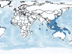 Omura's whale are found in the Indo-Pacific and the Atlantic Oceans, primarily in shelf waters between 35° N and 35° S, with the majority of records in the tropics (between 23° 26' N and 23° 26' S).[19] Their range includes southern Japan (with strandings and entanglements recorded in March and from May to October; including the prefectures of Yamaguchi,[33] Miyazaki,[34] Kagawa,[35] Mie, Shizuoka, and Chiba),[19] South Korea[36] (December to January, from the provinces of South Jeolla and South Gyeongsang),[19] China[37][38] (with strandings from November to February and in August; including the provinces of Zhejiang, Fujian, Guangdong,[18] and Guangxi),[20] Taiwan (with strandings from November to March and in May; there are also sightings from April to May and July to August),[14][39] Hong Kong (March),[40][41] the Philippines[42] (Manila Bay, Busuanga,[19] and the Bohol Sea),[24] Vietnam (Quảng Ngãi Province),[19] Malaysia (Pahang),[43] Thailand (with sightings and strandings from February, May to June, and November to December; including the provinces of Phang Nga, Phuket,[14] Prachuap Khiri Khan, and Songkhla),[19] Indonesia (with sightings and strandings from February, April to June, and from September to November; with records from West Sumatra, the southern Java Sea, Bali,[19] Komodo,[30] the Solor Archipelago, Seram, Raja Ampat Islands, and East Kalimantan),[19] the Cocos (Keeling) Islands,[5] the Andaman Islands (April),[19] Australia (Western Australia from Exmouth[44] to north of Darwin in the Northern Territory at about 9° 30' S - 10° S, 130° E),[45] South Australia[46] (January, Gulf St Vincent), Queensland (November to December, Port Douglas and Mission Beach),[47] the Solomon Islands,[48] New Caledonia,[49] Sri Lanka (February),[50] the Chagos Archipelago,[19] Iran (September, Strait of Hormuz),[51] Egypt (April, the northern Red Sea)[19] northwestern Madagascar (12° 01' S to 19° 23' S, with sightings by researchers from August and October to December, by whale watch operators from April to December, and acoustically detected year-round),[31] Mauritania (November, Trarza Region),[52] Brazil (September, Ceará),[21] and in the vicinity of the Saint Peter and Saint Paul Archipelago.[19]
