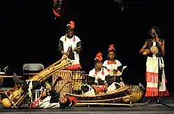 The balafon (pronounced /ˈbæləfɒn/, or, by analogy with xylophone etc., /ˈbæləfoʊn/) is a gourd-resonated xylophone, a type of struck idiophone.[1] It is closely associated with the neighbouring Mandé, Bwaba Bobo, Senoufo and Gur peoples of West Africa,[1][2] particularly the Guinean branch of the Mandinka ethnic group,[3] but is now found across West Africa from Guinea, Burkina Faso, Mali.[2] Its common name, balafon, is likely a European coinage combining its Mandinka name ߓߟߊ bála ([bala˦])[4] with the word ߝߐ߲ fóo (nyáa) ([foː˦ ɲaː˦]) 'to say / method of saying'[2][5] or the Greek root phono.[1]