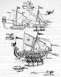 "They have other ships they call birocos, these are much larger than the ones mentioned earlier, some capable of carrying 500 or 600 fanegas of wheat. They are also oared, but they are very long and are moored to the ship like ours, and are of a different design. These are the biggest of their boats; the rest are small and are called by many different names and have different designs and need not be described here because they are unimportant."