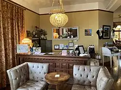 The hotel has 19 guest bedrooms plus a suite on the third floor with a view of Mount Hood and private whirlpool tub. Each room has an individual style with antique furnishings and unique period décor. All the rooms on the south side of the building have private baths. The rooms on the north side share common bath facilities with original claw-foot tubs.[3][4][8][9]