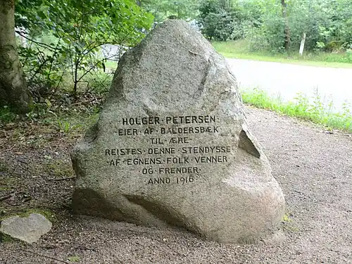 Baldersbæk is a house and forest estate 25 km northwest of Vejen, Denmark. Planted by Holger Petersen in the 1890s, Baldersbæk Plantation is the largest of the so-called "Copenhagener Plantations" (Danish: Københavnerplantager). The plantations were created in the years around 1900 by wealthy Copenhageners to promote soil melioration in Western Jutland. Villa Baldersbæk was constructed for him in 1910. The adjacent park features a number of monuments by Anders Bundgaard as well as other features. The estate is now owned by the Holger Petersen Foundation. The park is open to the public.
