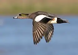 The breeding male (drake) is a striking bird with a mask of green feathers around its eyes and a cream-colored cap running from the crown of his head to his bill. This white patch gives the wigeon its other common name, baldpate (pate is another word for head).[14] His belly is also white.[15] In flight, drakes can be identified by the large white shoulder patch on each wing. These white patches flash as the birds bank and turn. In nonbreeding (eclipse) plumage, the drake looks more like the female.[10]