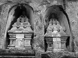 It is not known precisely where the capital of the kingdom was during the 10th and 11th centuries, but the political, religious, and cultural centre of the kingdom may have been in the present-day Gianyar Regency, inferred from the concentration of archaeological finds in this area.[4] The stone cave temple and bathing place of Goa Gajah, near Ubud in Gianyar, was made around the same period. It shows a combination of Buddhist and Hindu Shivaite iconography. Several carvings of stupas, stupikas (small stupas), and images of Boddhisattvas suggest that the Warmadewa dynasty was a patron of Mahayana Buddhism. Nevertheless, Hinduism was also practised in Bali during this period.