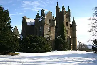 It was designed in 1859 by the architect William Burn.[2] A typical example of the Scottish Baronial style, it features an abundance of turreted towers and gables, and a now-missing oriel window. The main tower is topped by a balustraded viewing platform similar to that of Buchanan Castle.