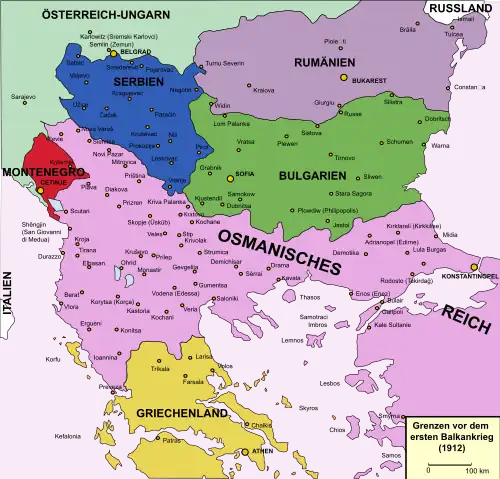 The war was a comprehensive and unmitigated disaster for the Ottomans, who lost 83% of their European territories and 69% of their European population.[10] As a result of the war, the League captured and partitioned almost all of the Ottoman Empire's remaining territories in Europe. Ensuing events also led to the creation of an independent Albania, which dissatisfied the Serbs. Bulgaria, meanwhile, was dissatisfied over the division of the spoils in Macedonia and attacked its former allies, Serbia and Greece, on 16 June 1913, which provoked the start of the Second Balkan War.