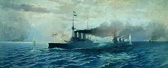 Nevertheless, at the outbreak of the war, the Greek fleet was far from ready. The Ottoman battlefleet retained a clear advantage in the number of ships, speed of the primary surface units and, most importantly, the number and calibre of the ships' guns.[35] In addition, as the war caught the fleet in the middle of its expansion and reorganization, a full third of the fleet (the six new destroyers and the submarine Delfin) reached Greece only after hostilities had started, forcing the navy to reshuffle crews, who consequently suffered from lacking familiarity and training. Coal stockpiles and other war stores were also in short supply, and the Georgios Averof had arrived with barely any ammunition and remained so until late November.[36]