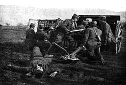 Due to poor organization, transportation problems and the protracted war with Italy, the Ottoman order of battle only had 12,024 officers, 324,718 other ranks, 47,960 animals, 2,318 artillery pieces and 388 machine guns ready by early October instead of the planned full complement of 750,000 officers and soldiers.[22] A total of 920 officers and 42,607 men of them had been assigned to non-divisional units and services, the remaining 293,206 officers and men were assigned to four armies.[23]