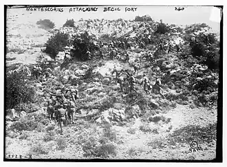 The failure of the Şarköy-Bulair operation and the deployment of the Second Serbian Army, with its much-needed heavy siege artillery, sealed Adrianople's fate. On 11 March, after a two weeks bombardment, which destroyed many fortified structures around the city, the final assault started, with League forces enjoying a crushing superiority over the Ottoman garrison. The Bulgarian Second Army, with 106,425 men and two Serbian divisions, with 47,275 men, conquered the city, with the Bulgarians suffering 8,093 and the Serbs 1,462 casualties.[64] The Ottoman casualties for the entire Adrianople campaign reached 23,000 dead.[65] The number of prisoners is less clear. The Ottoman Empire began the war with 61,250 men in the fortress.[66] Richard Hall noted that 60,000 men were captured. Adding to the 33,000 killed, the modern "Turkish General Staff History" notes that 28,500-man survived captivity[67] leaving 10,000 men unaccounted for[66] as possibly captured (including the unspecified number of wounded). Bulgarian losses for the entire Adrianople campaign amounted to 7,682.[68] That was the last and decisive battle that was necessary for a quick end to the war[69] even though it is speculated that the fortress would have fallen eventually because of starvation. The most important result was that the Ottoman command had lost all hope of regaining the initiative, which made any more fighting pointless.[70]